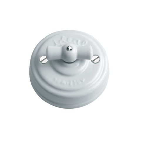 Interruptor de porcelana con mecanismo rotativo. Original diseño, replica del interruptor antiguo de las primeras instalaciones eléctricas. Ideal para entornos rústicos o para dar un toque vintage a tu decoración. Mecanismo conmutado (permite el encendido combinado desde dos puntos). Fabricado en porcelana. Con lazo (maneta) de porcelana.