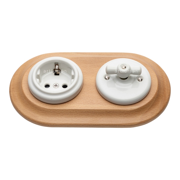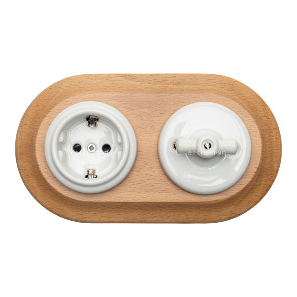Conjunto formado por interruptor conmutado y base de enchufe fabricados en porcelana blanca y marco doble de madera clara. Para instalación empotrada.
