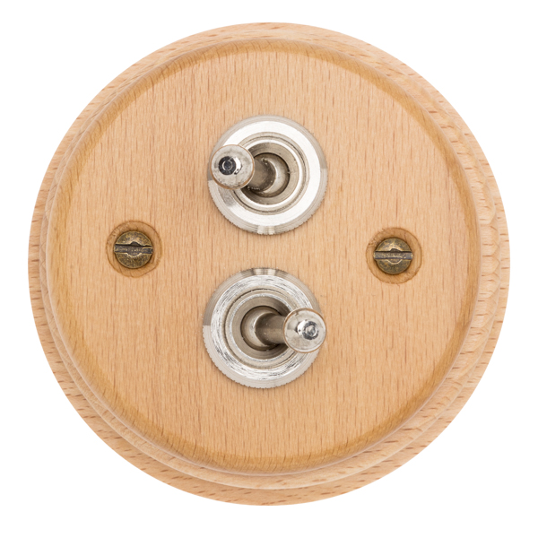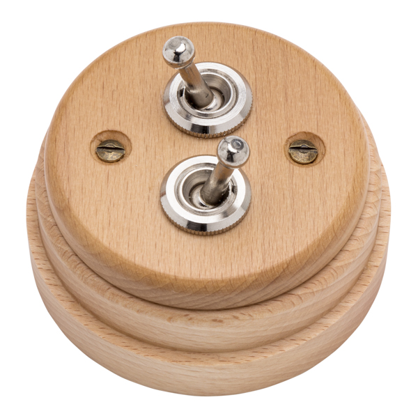 Juego de dos interruptores tipo “rabillo”, fabricado en madera de haya barnizada en acabado natural. Robustos mecanismos de palanca fabricados en níquel.