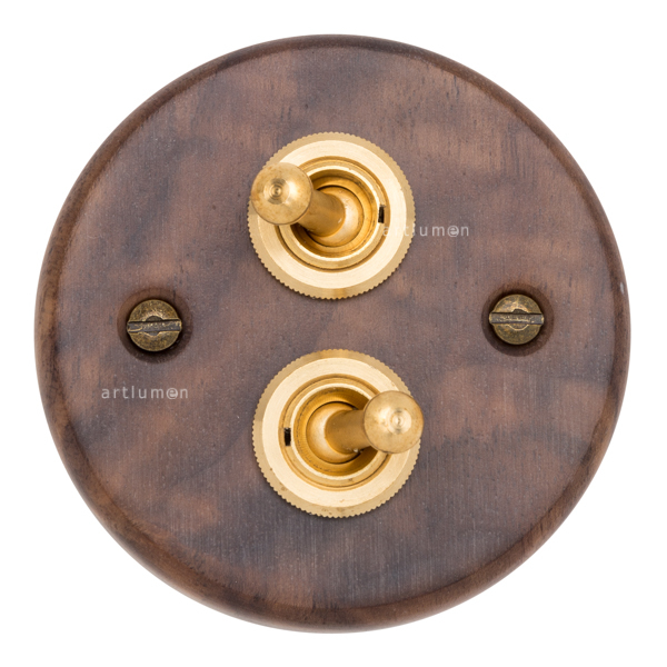 Juego de dos interruptores tipo “rabillo”, fabricado en madera de nogal americano. Robustos mecanismos de palanca fabricados en latón.