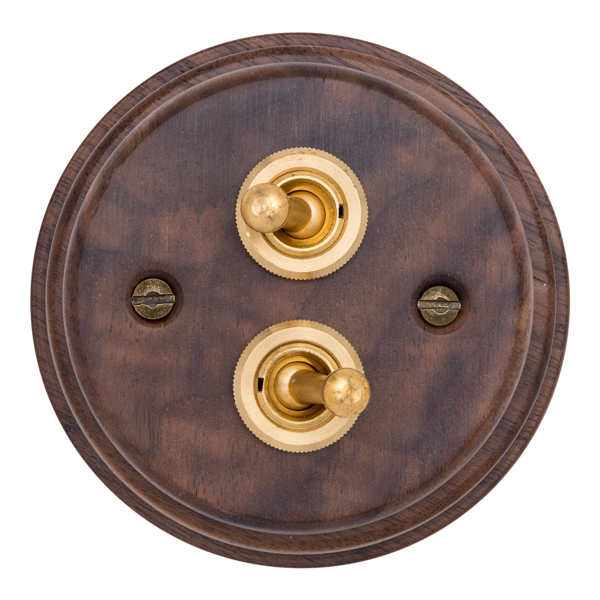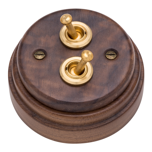 Juego de dos interruptores tipo “rabillo”, fabricado en madera de nogal americano. Robustos mecanismos de palanca fabricados en latón.