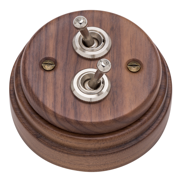 Juego de dos interruptores tipo “rabillo”, fabricado en madera de nogal americano. Robustos mecanismos de palanca fabricados en níquel.