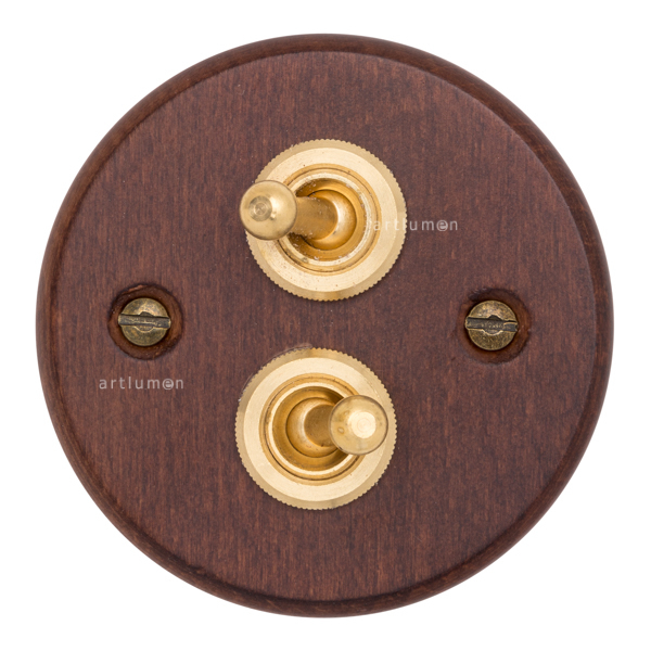 Juego de dos interruptores tipo “rabillo”, fabricado en madera de haya barnizada en color castaño oscuro.
