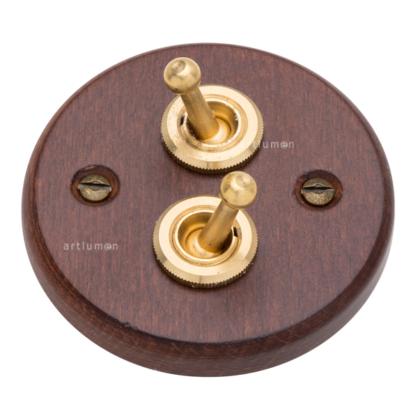 Juego de dos interruptores tipo “rabillo”, fabricado en madera de haya barnizada en color castaño oscuro.