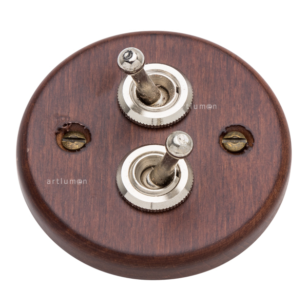 Juego de dos interruptores tipo “rabillo”, fabricado en madera de haya barnizada en color castaño oscuro.