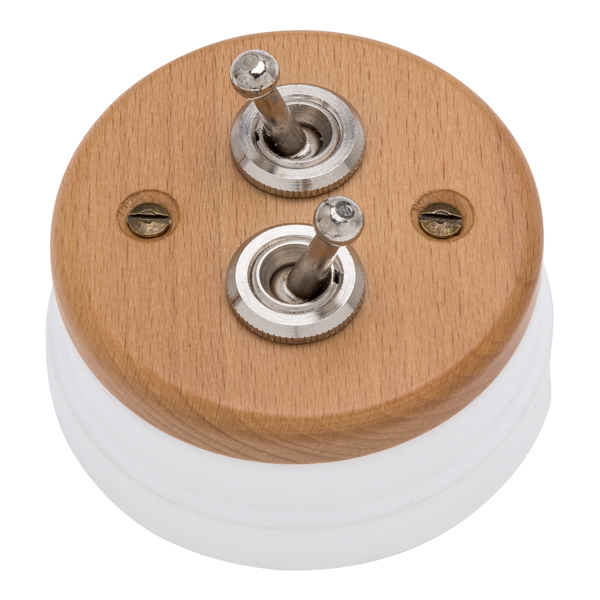Juego de dos Interruptores de palanca, tipo “rabillo”, fabricados en níquel, sobre placa de madera de haya barnizada en acabado natural. Con base (marco) de porcelana blanca.