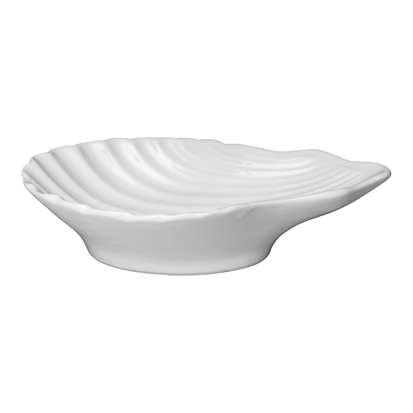 Bonita jabonera de porcelana blanca en forma de concha. Accesorio de baño para colocar la pastilla de jabón en el lavabo o ducha.