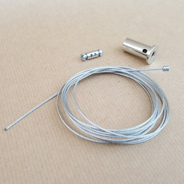 Kit suspensión de acero 1,2 mm , con terminal de 5mm para luminarias. Cable de hasta 2 metros de longitud. Sujeción de luminaria por tornillo prisionero. Sujeción al techo por pipeta-florón cromada. Carga máxima 15 Kg