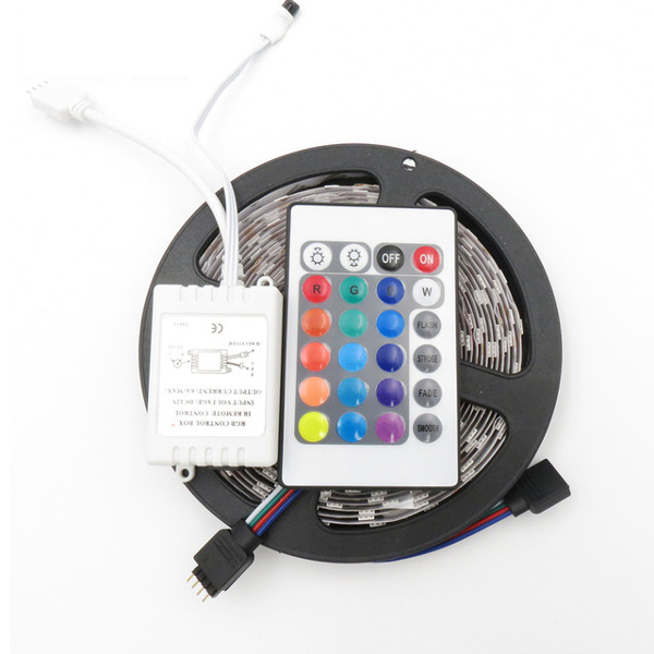 Kit formado por tira led RGB en rollo de 5m, receptor con mando a distancia y adaptador de corriente.