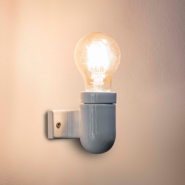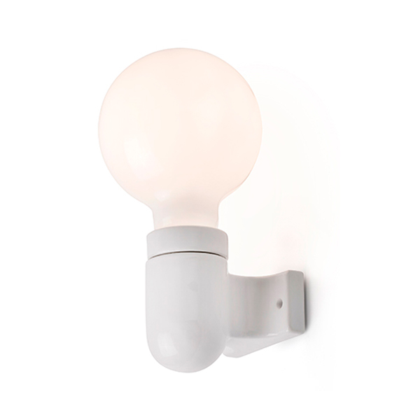 Lámpara aplique de pared fabricado en porcelana blanca. Se caracteriza por su estilo atemporal. Ideal para colocar al lado del espejo de baño.