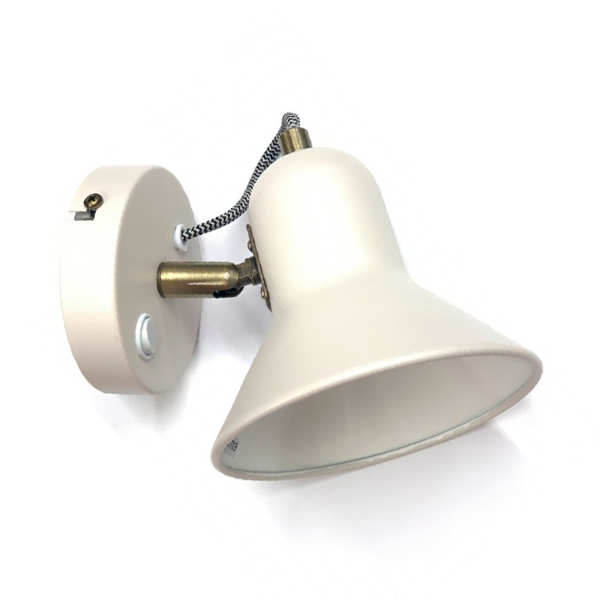 Lámpara con foco metálico para instalar en pared o techo de estilo industrial. De metal, en color blanco roto, con rótula dorado viejo para poder dirigir la pantalla. Incorpora un interruptor en la base. Cable textil de color blanco y negro tipo cable de plancha.