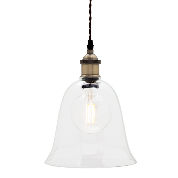 Elegante lámpara de techo con cristal transparente. Compuesta por portalámparas metálico de color bronce envejecido y florón de techo a juego. El cable textil de color marrón tipo trenzado aporta sobriedad y elegancia a esta lámpara de estilo rústico con mucho encanto. La campana de cristal transparente con que se adorna permite que la luz pueda difundirse bien por toda la estancia, al mismo tiempo que muestra el encanto de la bombilla. Esta lámpara de cristal es adecuada para iluminar de manera regular y uniforme un dormitorio, recibidor, salón… etc.