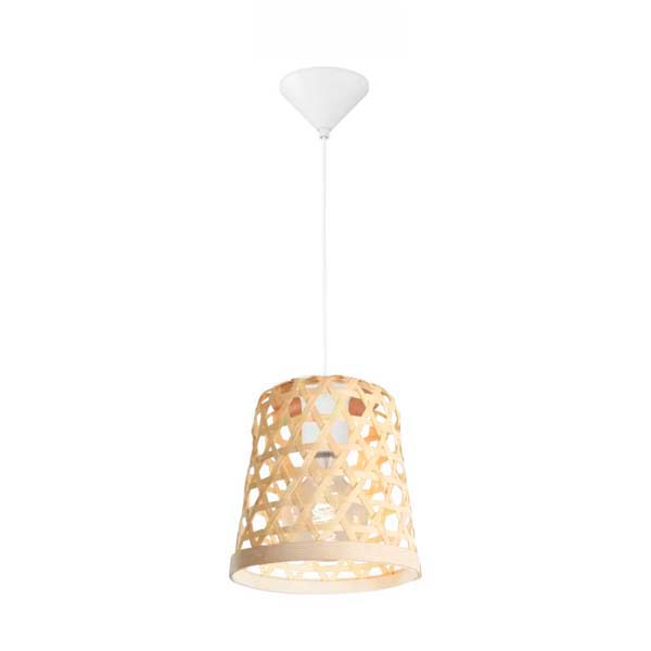 Lámpara de techo con pantalla de bambú  y colgante de color blanco.