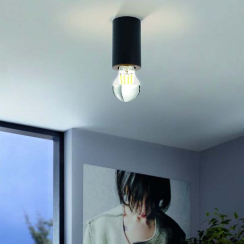 Moderna lámpara de techo minimalista. Cilindro liso de acero en color negro mate. Ideal para decoraciones en baño, recepciones, pasillos, etc.