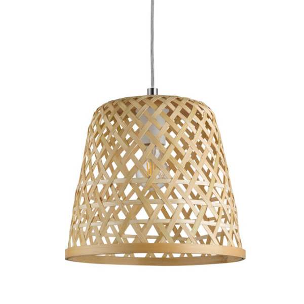 Lámpara de techo colgante de acero y pantalla de madera natural.