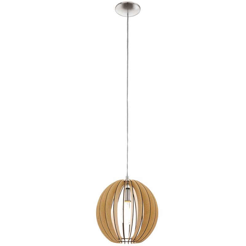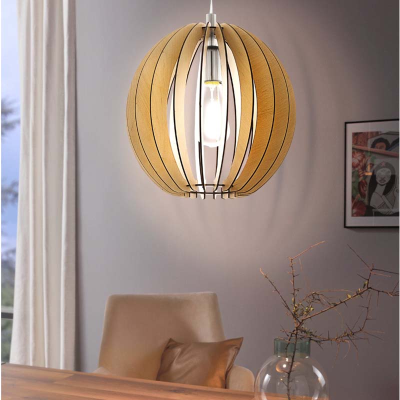 Lámpara para suspender en techo con estructura de lamas de madera clara de arce. Esta moderna y original lámpara de techo está hecha con una estructura de lamas de madera que conforman una original estructura de formas ovaladas. De acabados delicados: florón de acero níquel satinado, cable transparente, y funda de portalámparas de acero, proporciona un toque sofisticado y actual a cualquier rincón. Ideal para salones, dormitorios y ambientes que cuidan hasta el último detalle. Las lamas de madera hacen un encantador juego de luces y sombras cuando la luz se desliza a través de ellas.
