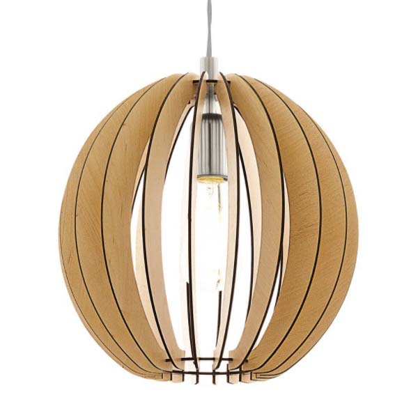Lámpara para suspender en techo con estructura de lamas de madera clara de arce. Esta moderna y original lámpara de techo está hecha con una estructura de lamas de madera que conforman una original estructura de formas ovaladas. De acabados delicados: florón de acero níquel satinado, cable transparente, y funda de portalámparas de acero, proporciona un toque sofisticado y actual a cualquier rincón. Ideal para salones, dormitorios y ambientes que cuidan hasta el último detalle.  Las lamas de madera hacen un encantador juego de luces y sombras cuando la luz se desliza a través de ellas.
