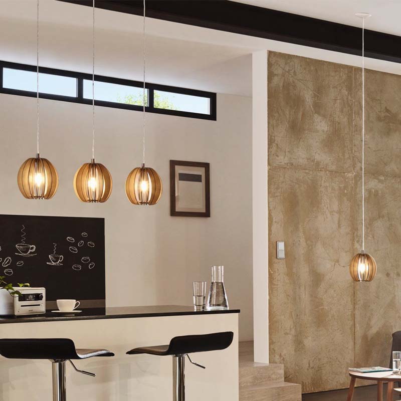 Lámpara para suspender en techo con estructura de lamas de madera clara de arce. Esta moderna y original lámpara de techo está hecha con una estructura de lamas de madera que conforman una original estructura de formas ovaladas. De acabados delicados: florón de acero níquel satinado, cable transparente, y funda de portalámparas de acero, proporciona un toque sofisticado y actual a cualquier rincón. Ideal para salones, dormitorios y ambientes que cuidan hasta el último detalle. Las lamas de madera hacen un encantador juego de luces y sombras cuando la luz se desliza a través de ellas.