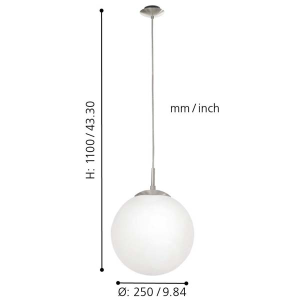 Lámpara de techo colgante. De acero en acabado níquel mate. Globo de vidrio opalino mate de 25cm de diámetro. Se puede usar como única lámpara o usar varias para hacer una composición.