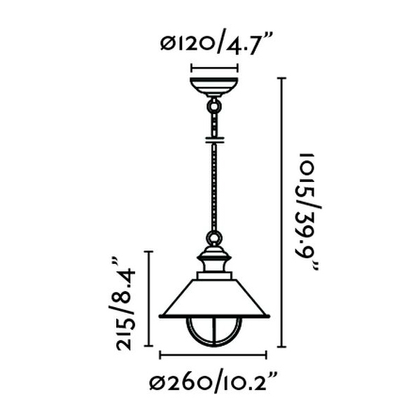 Colgante estilo rústico con aire marinero. Fabricado en hierro acabado marrón óxido. Tiene una campana metálica con un difusor de cristal burbuja protegido por una reja en la parte inferior.