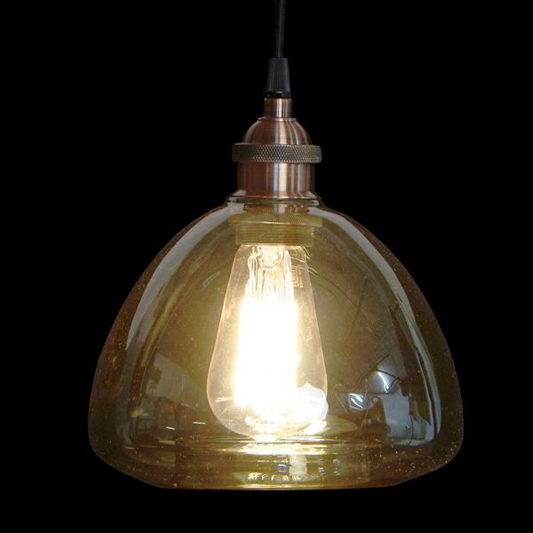 Lámpara para colgar de techo formada por un colgante metálico, acabado bronce envejecido, con cable forrado de textil negro, florón de techo metálico negro y pantalla de vidrio transparente tintado. Longitud del cable de 1m, regulable en altura.