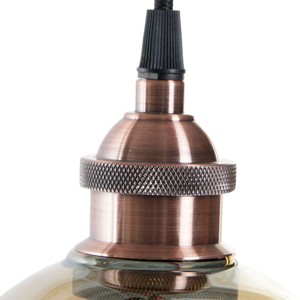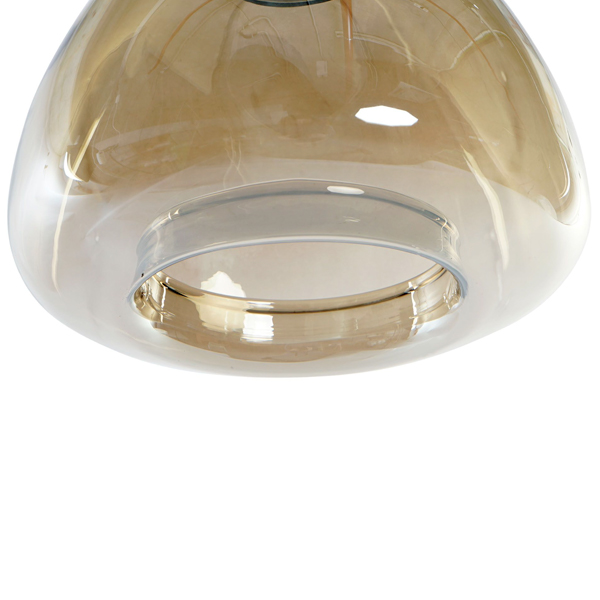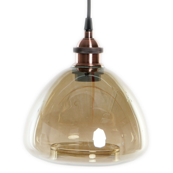 Lámpara para colgar de techo formada por un colgante metálico, acabado bronce envejecido, con cable forrado de textil negro, florón de techo metálico negro y pantalla de vidrio transparente tintado. Longitud del cable de 1m, regulable en altura.