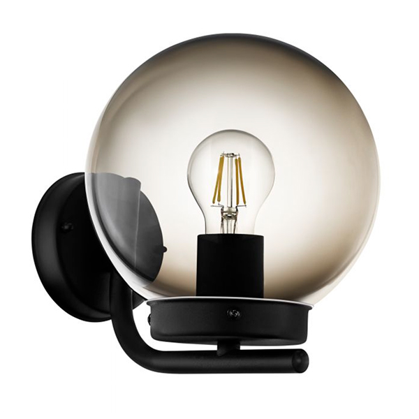 Lámpara de pared formada por un brazo de acero de color negro que sujeta la pantalla en forma de globo de plástico con acabado negro ahumado.