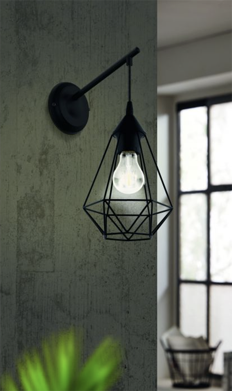 Lámpara de pared con un brazo metálico del que cuelga una pantalla metálica en forma de jaula.