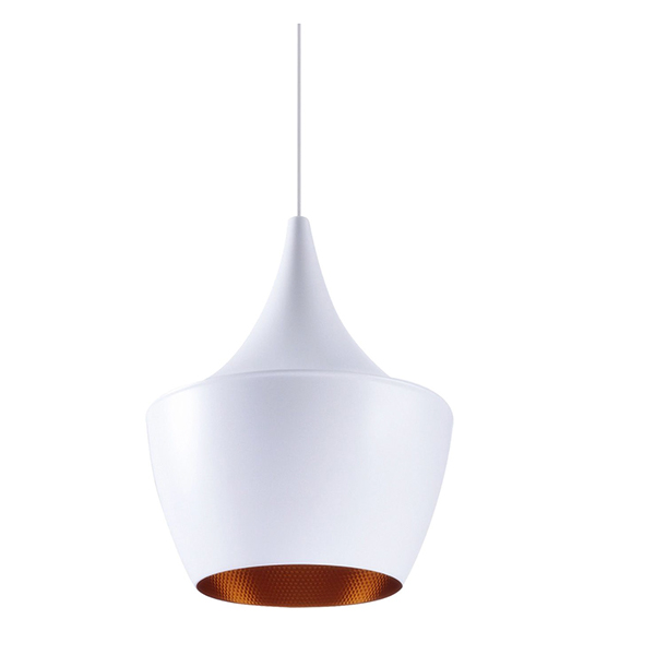 Lámpara de suspensión inspirada en el modelo Beat Fat de Tom Dixon. Fabricada en aluminio de color blanca, acabado mate, que contrasta con su interior dorado. Cable y embellecedor en color blanco. Destacamos el color dorado de su interior, en el cual se refleja la luz adquiriendo un bonito tono cobrizo. Elegante diseño clásico que combina también en decoraciones modernas, tanto en viviendas como en oficinas y comercios. Se puede aplicar sola o en combinación con los otros modelos de la misma colección.