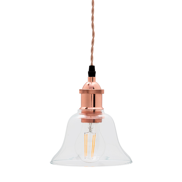 Lámpara de techo compuesto por una tulipa de cristal transparente en forma de campanita, portalámparas de bronce envejecido, cable textil de color marrón trenzado y florón de techo del mismo color bronce envejecido. Esta lámpara de techo de estilo retro de cristal transparente nos ayuda a iluminar el interior de forma eficiente y uniforme. Como es de tamaño reducido es perfecta para ambientes donde el techo no es muy alto. A través del cristal podemos ver la bombilla, perfecto si nos decidimos por una de las modernas bombillas de filamentos.