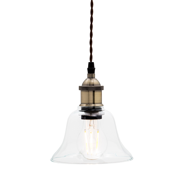 Lámpara de techo compuesto por una tulipa de cristal transparente en forma de campanita, portalámparas de bronce envejecido, cable textil de color marrón trenzado y florón de techo del mismo color bronce envejecido. Esta lámpara de techo de estilo retro de cristal transparente nos ayuda a iluminar el interior de forma eficiente y uniforme. Como es de tamaño reducido es perfecta para ambientes donde el techo no es muy alto. A través del cristal podemos ver la bombilla, perfecto si nos decidimos por una de las modernas bombillas de filamentos.