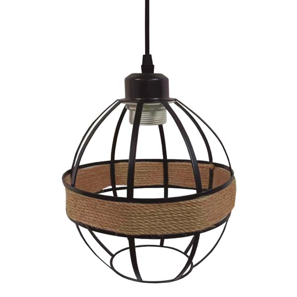 Lámpara de techo jaula de metal color negro con una franja de yute. Con casquillo estándar para bombillas de rosca E-27. Recomendamos el uso de bombillas LED. El cable permite ajustar la lámpara a diferentes alturas.