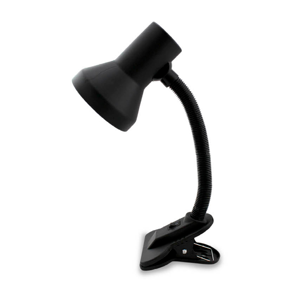 Lámpara de escritorio con pinza de sujeción. Campana metálica de color negro. Flexo orientable para iluminar esas zonas que requieren un toque de luz. Dispone de un interruptor en la base de la pinza.