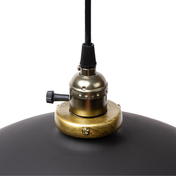 Encantadora lámpara retro de estilo provenzal. La pantalla es un plato metálico negro con reborde y blanco en su interior. Portalámparas metálico color oro pavonado con interruptor rotativo. La pantalla se sujeta al portalámparas con una anilla embellecedora de acabado latón envejecido. Florón de techo metálico de color negro. Cable redondo negro de 1,20m regulable en altura.
