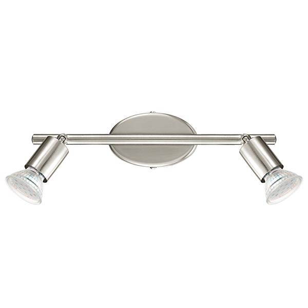 Lámpara de dos focos fabricado en acero con acabado níquel mate. Cada uno de los focos totalmente orientables. Para instalar en pared o techo. Bombillas LED incluidas de 3W (200 Lumens), de luz cálida (3000ºk). Posibilidad de utilizar otro tipo de bombillas LED o halógenas (de tipo GU-10)