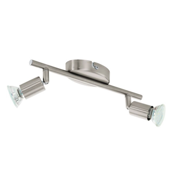 Lámpara de dos focos fabricado en acero con acabado níquel mate. Cada uno de los focos totalmente orientables. Para instalar en pared o techo. Bombillas LED incluidas de 3W (200 Lumens), de luz cálida (3000ºk). Posibilidad de utilizar otro tipo de bombillas LED o halógenas (de tipo GU-10)