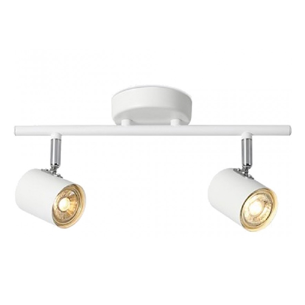 Lámpara de dos focos metálicos en color blanco mate. Totalmente orientables. Para instalar en pared o techo.