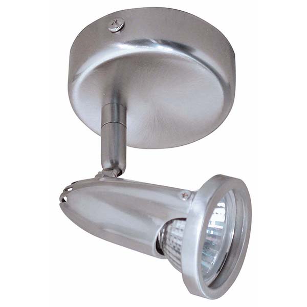 Lámpara de un foco metálico. Acabado cromo mate. Totalmente orientable. Para instalar en pared o techo. Portalámparas GU-10. Admite lámparas halógenas y LED.