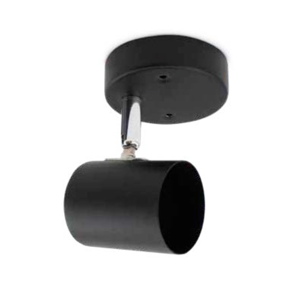 Lámpara foco metálico. Acabado negro mate con rótula cromada. Totalmente orientable. Para instalar en pared o techo.
