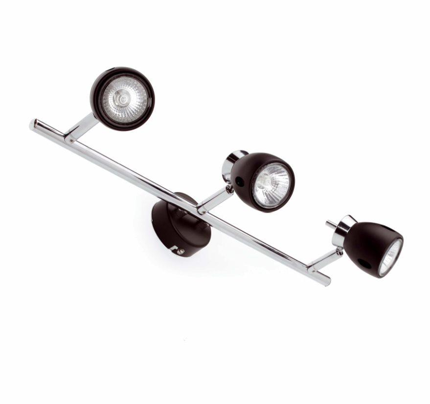 Lámpara de tres focos metálicos. Acabado Negro y Cromado. Totalmente orientables. Para instalar en pared o techo.