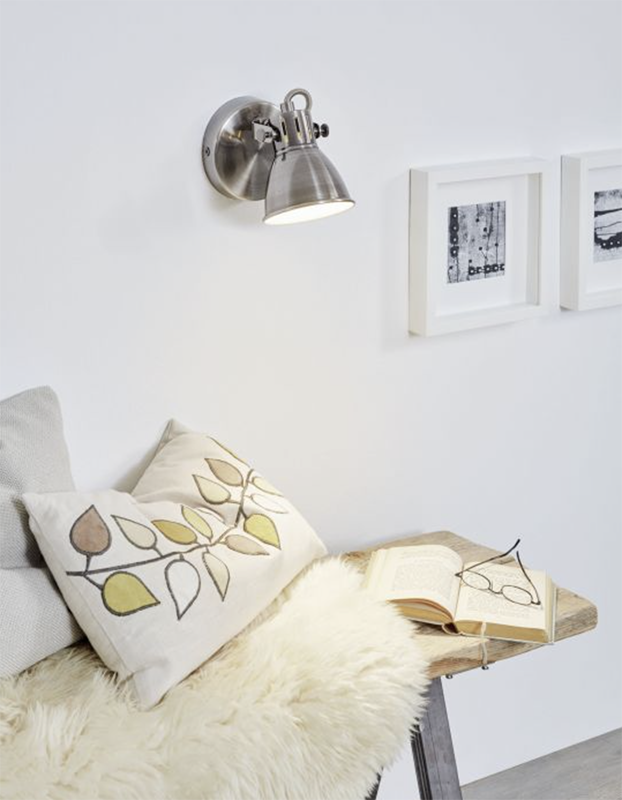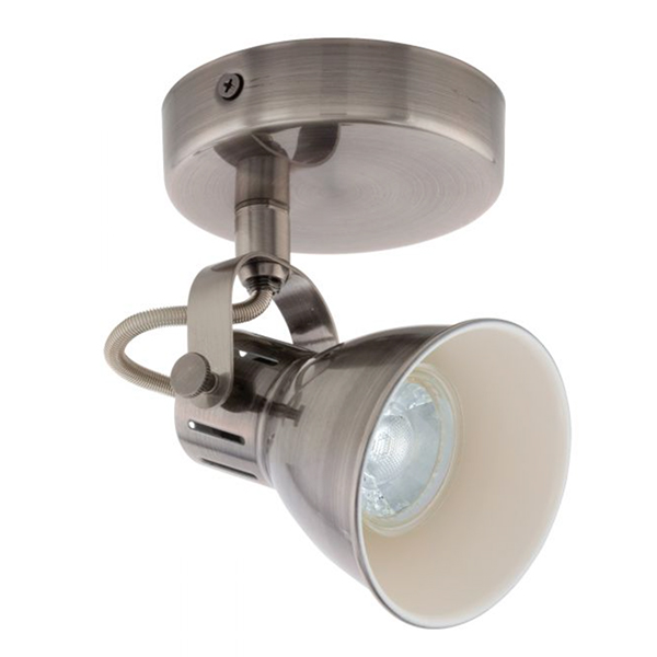 Lámpara de pared con campana de metal en acabado níquel antiguo. Totalmente orientable. Para instalar en pared o techo. Interior de la campana de color crema para mejorar la iluminación.