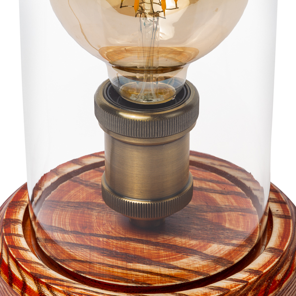 Lámpara de mesa formada por una base de madera efecto envejecida y una cúpula de cristal transparente para cubrir la bombilla. Casquillo de metal color oro envejecido para bombillas de rosca estándar E-27. Cable textil trenzado de color marrón de 1,2m con interruptor pasador en el centro. Recomendamos el uso de bombillas decorativas LED.
