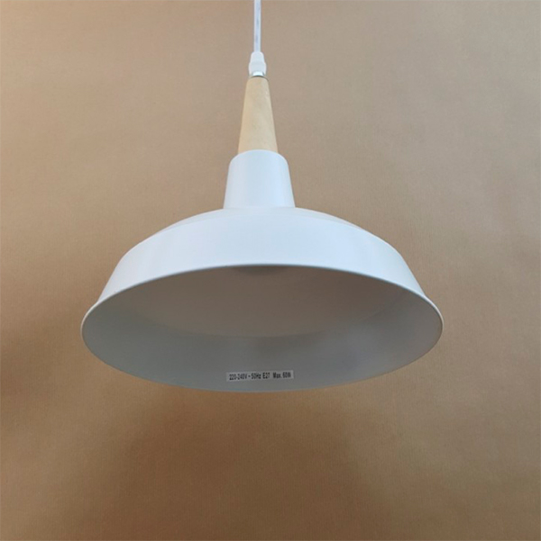 Lámpara de techo con pantalla blanca de aluminio pulido, rematada con embellecedor de madera natural.