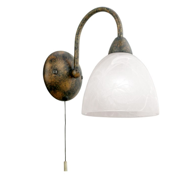 Lámpara de pared con un brazo metálico color óxido envejecido. Pantalla de vidrio alabastro blanco. Con interruptor de cordón.