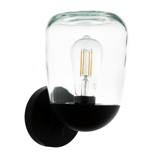 Lámpara de pared para exterior con brazo de color negro y pantalla redondeada de vidrio.