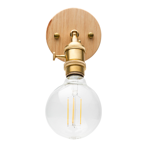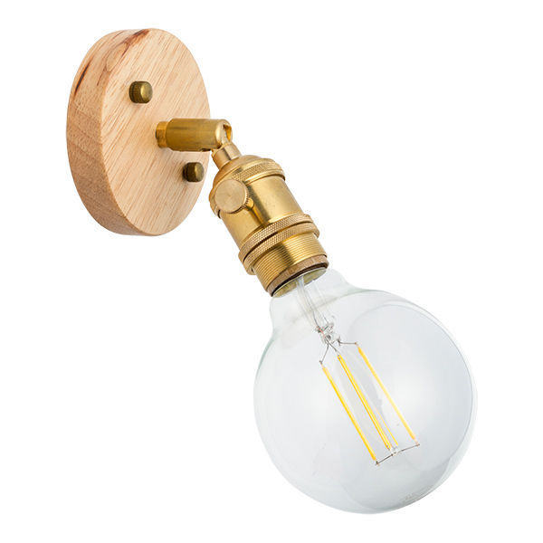 Lámpara aplique de pared o techo con base de madera. El portalámparas incluye un  interruptor rotativo para encender la bombilla. Dispone de una rótula para poder orientar el casquillo. La rótula y el portalámparas están fabricados en latón.