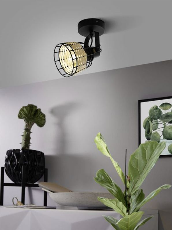 Lámpara de pared o techo con estructura de jaula metálica de color negra totalmente orientable. La pantalla esta decorada con tiras de rattán tejidas.