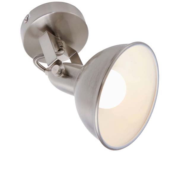 Lámpara de pared o techo en metal acabado níquel mate. Pantalla color níquel satinado con interior blanco. Giratoria y orientable. Su elegante diseño retro se adapta a todas las estancias.
