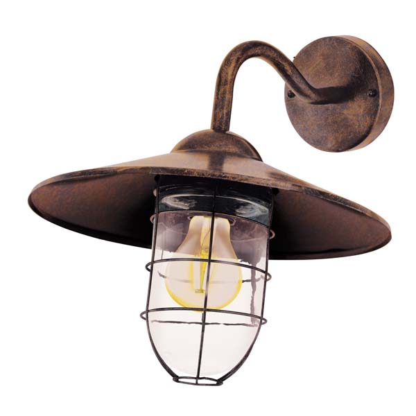 Lámpara de pared con una robusta estructura de acero en su brazo curvado y plato de aspecto clásico, en acabado cobre envejecido. La bombilla va protegida por una tulipa de vidrio transparente reforzada con una rejilla metálica.