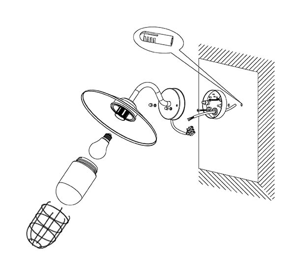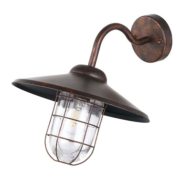 Lámpara de pared con una robusta estructura de acero en su brazo curvado y plato de aspecto clásico, en acabado cobre envejecido. La bombilla va protegida por una tulipa de vidrio transparente reforzada con una rejilla metálica.